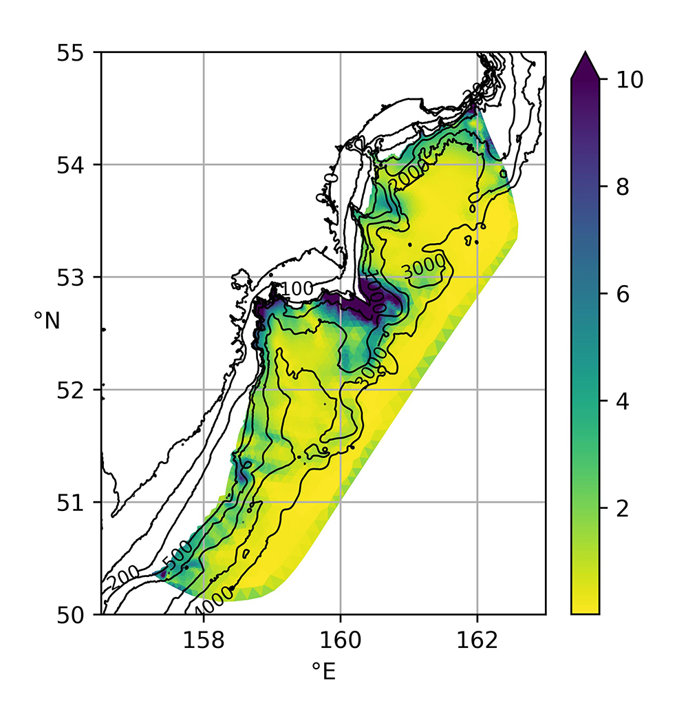 The research was conducted in the Pacific Ocean off the coast of the Kamchatka Peninsula and the northern Kuril Islands, where the main spawning areas of the East Kamchatka pollock population are located on the shelf and in deep-sea canyons.