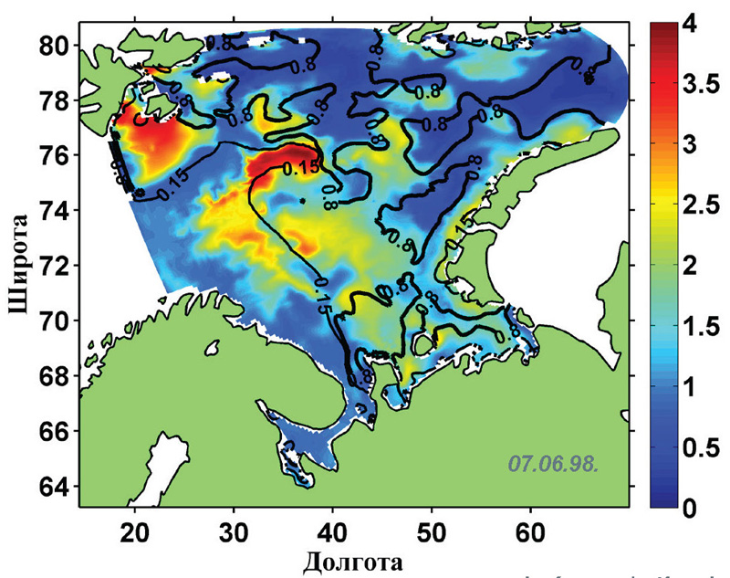 To get the estimates, we apply a three-dimensional eco-hydrodynamic model based on the Princeton Ocean Model which includes: 1) a module of sea ice with 7 categories, and 2) the 11-component module of marine pelagic ecosystem developed in the St. Petersburg Branch, Institute of Oceanology, RAS. Comparison of the model results for the period 1998-2007 with satellite data showed that the model reproduces the main features of the evolution of the sea surface temperature, seasonal changes in the ice extent, surface chlorophyll "a" concentration and the primary production of phytoplankton (PPP) in the Barents Sea. It is shown that the spring-summer bloom of phytoplankton in areas of the sea covered with ice occurs during the period of intensive destruction of the ice cover in its marginal zone. In particular, as can be seen in Fig. 1, on June 7, 1998, when a significant part of the sea was covered with ice, the areas of maximum concentrations of chlorophyll "a" were located in the marginal zone of the ice cover and in open water in the central part of the sea.